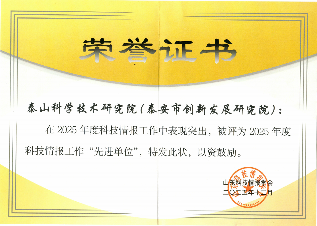 近日,山东科技情报学会八届五次理事会暨学术研讨会在潍坊青州召开。会议全面总结2025年度全省科技情报工作成效,对在科技情报服务、智库建设、成果转化等领域作出突出贡献的先进单位和个人进行了表彰。泰山科学技术研究院凭借扎实的工作成效与显著的服务价值,荣获“2025年度山东省科技情报先进单位”称号,院内两名同志获评“山东省科技情报先进个人”。